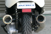 テーパー&カーブ。徐々に太くなりながら、カーブしている「BB−SHOOT(ビービーシュート)マフラー」の、ホンダ リード125用です。極限までボディのサイドラインにマッチングさせたサイレンサー形状が非常にレーシーです。サイレンサーはテーパー管をTIG溶接でつなぎ合わせ、溶接跡の焼け色も敢えてそのまま残しています。横からだけではなく、真後からのルックスも存在感抜群の3Dサイレンサーです。